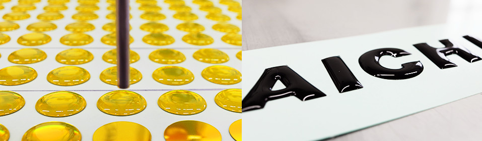 ポッティング加工(樹脂盛り)とは、ステッカー・シールラベル・アルミ金属類などに、